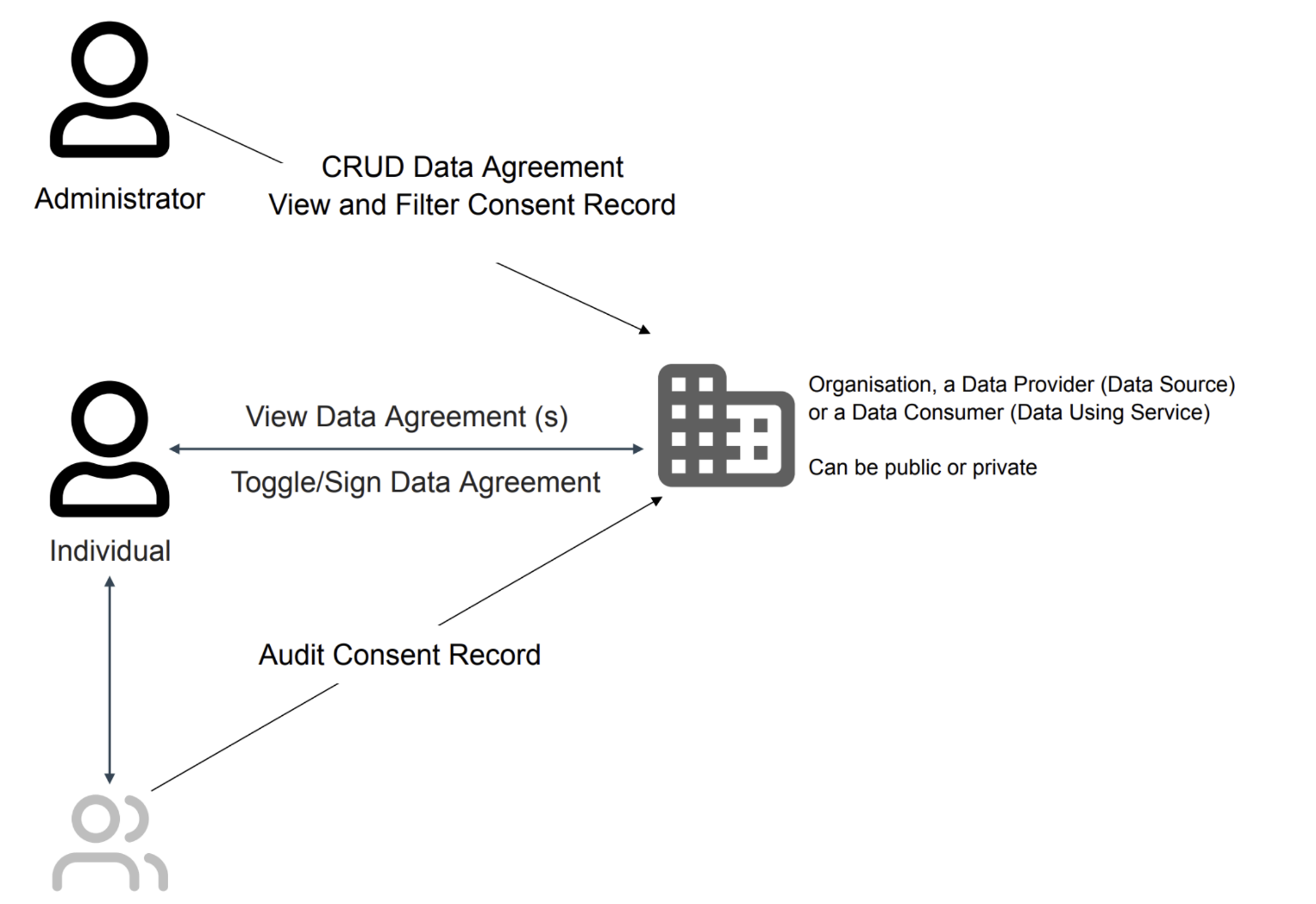 - A data processing Auditor (or regulatory body) oversees and assures adherence to contracted and regulatory requisites within the system. By maintaining a vigilant stance, the Auditor upholds the integrity of the consent ecosystem, fostering trust between individuals and data processors.