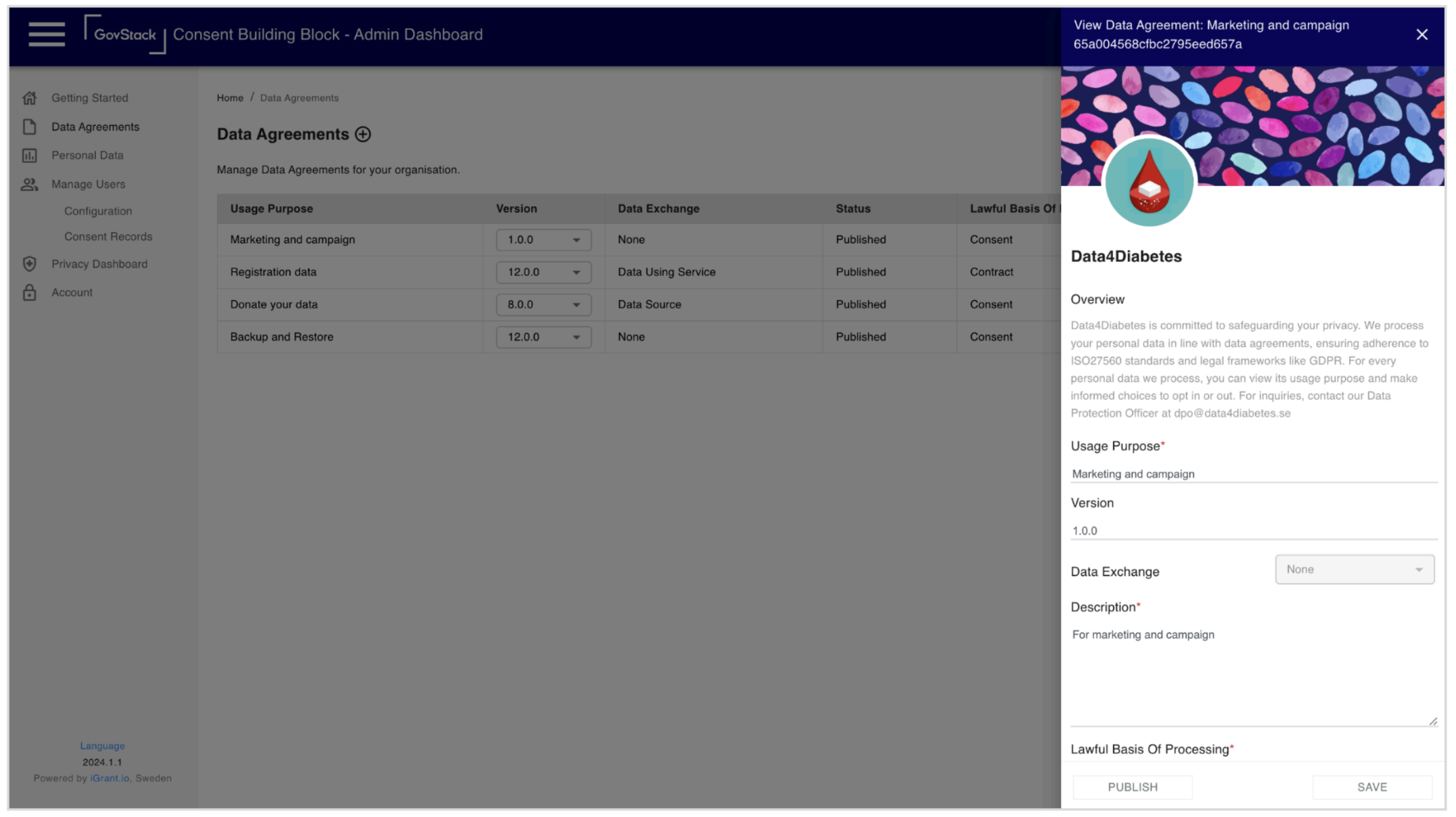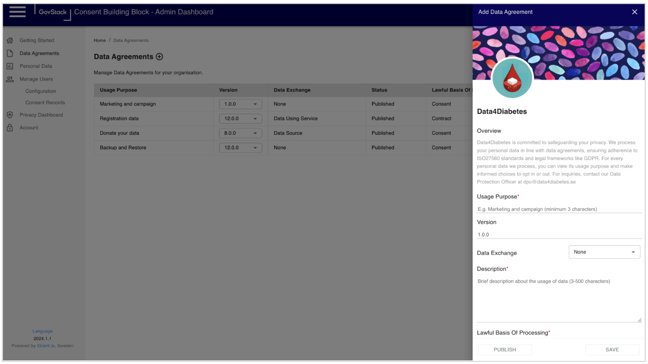 The organisation's admin user can orchestrate personal data processing via the admin dashboard. With the help of the dashboard, the admin user can perform all CRUD (create, read, update and delete) operations on Data agreements. The portal also audits user consent, revision handling, and compliance management.